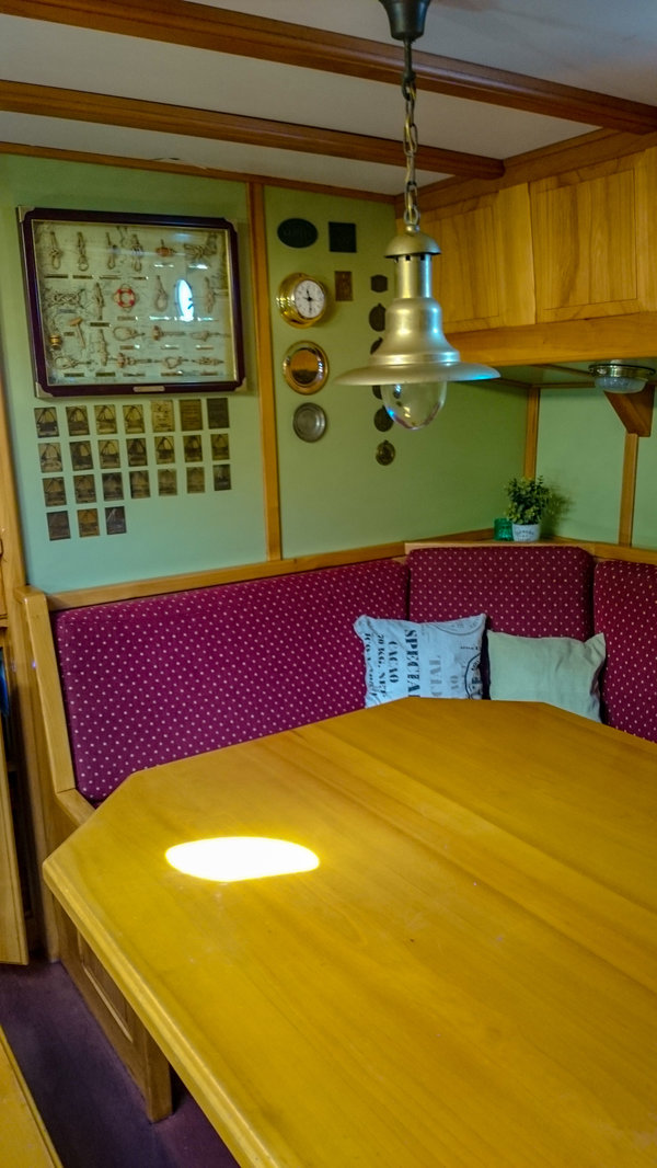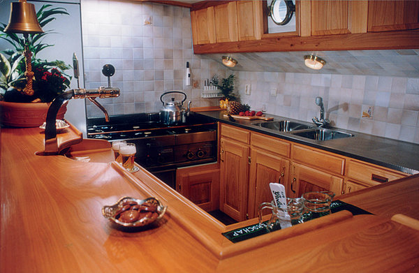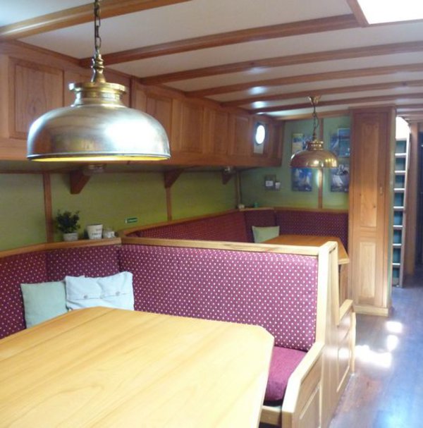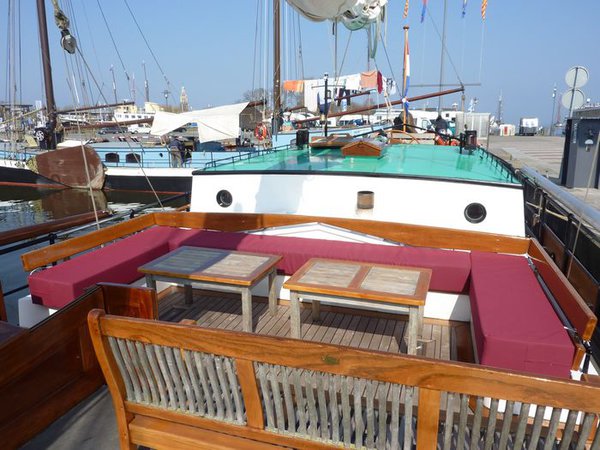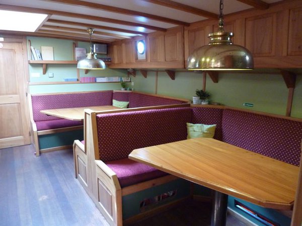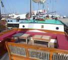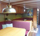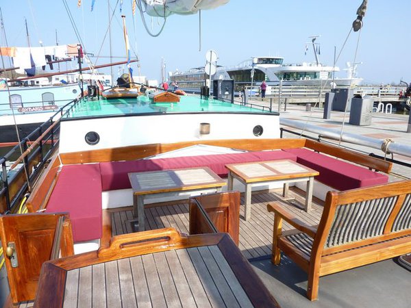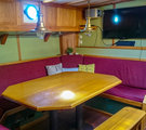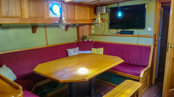 Sie werden staunen wie gemütlich und komfortabel das Interieur sein kann. Unter Deck finden Sie einen hellen Tagesraum mit drei geräumigen Sitzecken. Die gut ausgestattete Küche gibt Ihnen allen Komfort den Sie von zu Hause kennen, und ist ausgerüstet um für bis zu 30 Personen zu kochen: sechs Gasplatten, ein großer Kühlschrank von 375L und selbst ein Gefrierschrank von 125L stehen für Sie zur Verfügung! Und nicht zu vergessen die handgefertigte Bar mit Zapfanlage, die für fröhliche Abende an Bord sorgt. Ein Breitbildfernseher mit DVD und eine qualitativ gute Stereoanlage sowie eine Jukebox garantieren unvergessliche Stunden...