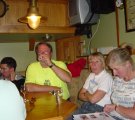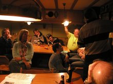Kurz vor 21:00 Uhr gehen wir zusammen zu De Nieuwe Doelen zur Siegerehrung. Von außen sieht der Laden recht unscheinbar aus und wir fragen uns, wo die vielen Leute Platz finden sollen. Innen stellt man dann aber fest, dass es im hinteren Bereich einen großen Saal gibt. Auf der Bühne spielt eine Musikgruppe. Die Luft ist warm und ziemlich verräuchert. Wir kämpfen uns in die vordere Reihe durch. Christine versorgt uns mit leckerem frischem Bier.