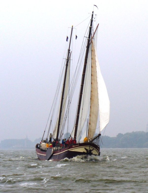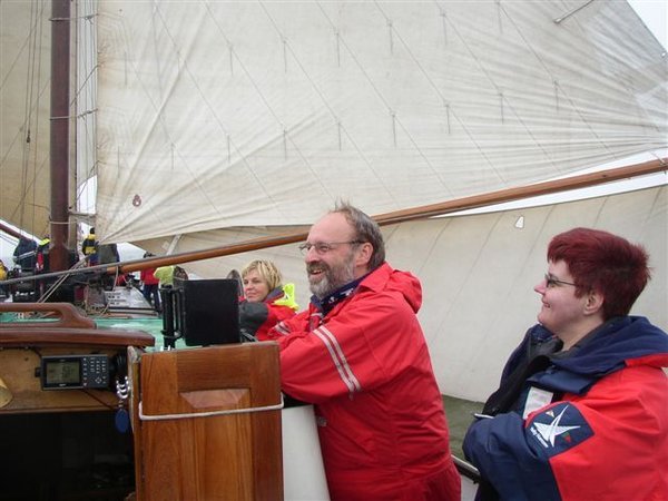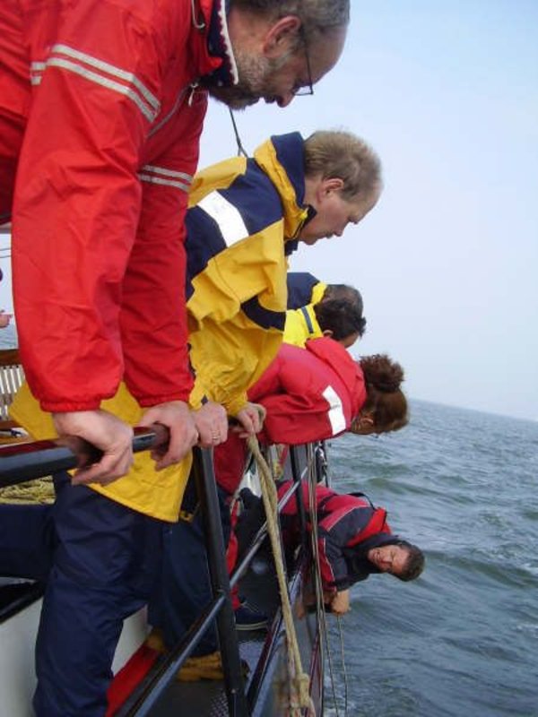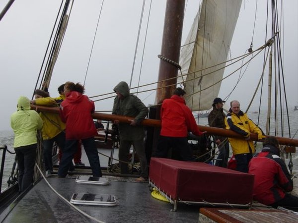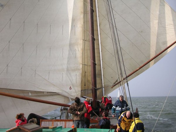 Auf dem Mitteldeck stehen Andreas, Gerry, Heiner, Patrick, und Anneke. Ruth kümmert sich um Backstagen und die Wassersegelschot. Léon und sein Bruder Frans teilen sich das Steuer. Bouke setzt Leons Anweisungen um und kontrolliert das Vor- und Mittelschiff. Die übrigen Crew-Mitglieder gehen dort zur Hand, wo gerade Hilfe gebraucht wird.