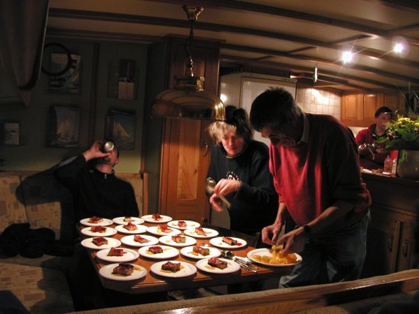 Eine wichtige Aufgabe wurde bis jetzt noch nicht erwähnt. Nichts funktioniert ohne Energie – und dafür ist Léons Frau Christine zuständig. Sie kümmert sich um das leibliche Wohl der Crew. Das fängt schon vor dem Törn mit dem Bunkern der Lebensmittel und Getränke an. Während der Regatta sorgt sie für die Zwischenmahlzeiten. Abends gibt es dann ein mehrgängiges leckeres Essen. Dabei unterstützt die Crew sie nach besten Kräften.