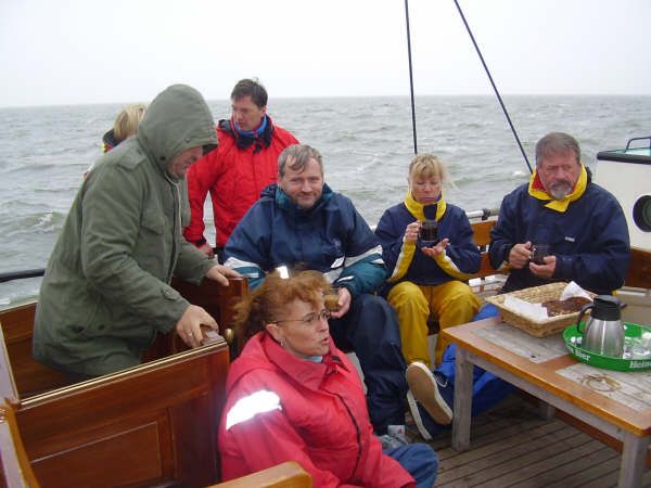 Um 12:45 Uhr ist Brotzeit. Der Kurs ist günstig; wir fahren auf einem ruhigen Raumschotkurs. Es gibt heiße Bolognesesuppe mit belegten Brötchen.