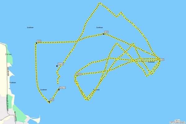 Von der Rennkommission wurde beschlossen, dass die lange Strecke zu segeln ist. Nach dem Passieren der Startlinie müssen die Bojen 1 und 4 dreimal umrundet werden. Danach ist ein Trapez zu segeln: