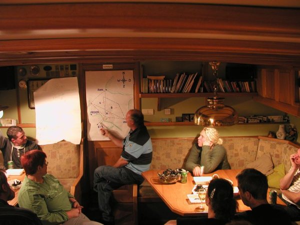Nach dem Essen kam die theoretische Vorbereitung auf den morgigen Tag. Bouke hatte eine Skizze auf ein Flipp-Chart-Blatt vorbereitet. Leon machte sich daran uns zu erklären, was uns beim Drei-Städte-Rennen erwartet. Er nahm sich dafür viel Zeit – sehr viel Zeit. Während er erzählte, kümmerte er sich um übrig gebliebene Muscheln. Beim Drei-Städte-Rennen gibt es drei verschiedene Dreiecke, die gesegelt werden können, die durch die 4 Städte Medemblik, Stavoren, Urk und Enkhuizen gebildet werden. Hinzu kommt, dass die Dreiecke sowohl im, als auch gegen den Uhrzeigersinn befahren werden können. Dabei ergeben sich sechs Varianten:
