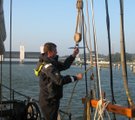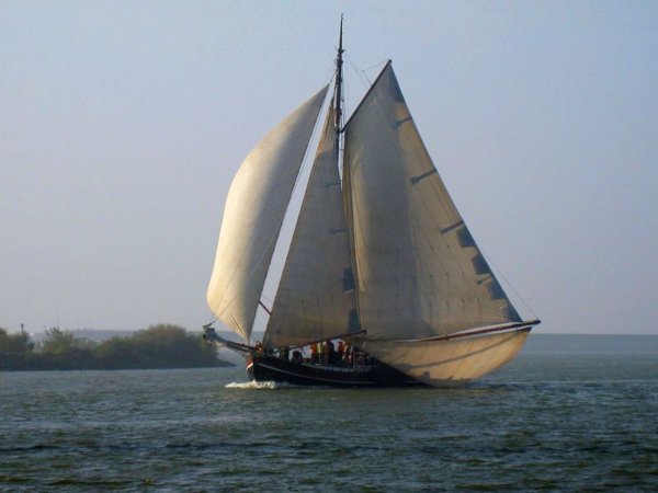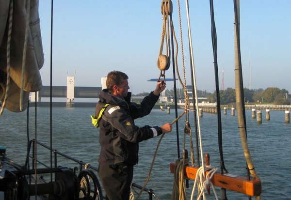 Eine dreiviertel Stunde später erreichten wir die Ansteuerungstonne von Lemmer und wir wechselten auf einen Halbwindkurs. Zunächst wurden wir wieder etwas schneller. Mit der Annäherung an Stavoren ließ der Wind jedoch etwas nach, so dass wir noch im Bereich von 7 Knoten lagen. Leon beobachtete ständig die Segelstellung. Immer wieder kamen Kommandos zur Optimierung. Wie schon im letzten Jahr mussten wir wieder einmal die Erfahrung machen – nach fest kommt ab. Plötzlich gab es einen kleinen Ruck und das Klüversegel schoss nach oben. Was war passiert? Die Befestigung des Segels an der Klüverstagpütting war gerissen. Sofort ließen wir das Klüverfall durchrauschen und holten das Segel mit der Schot herunter. So schnell wie möglich befestigten wir das Segel wieder und zogen es wieder hoch. So schnell wir auch reagierten – einige Sekunden hatte uns die Aktion sicherlich gekostet.