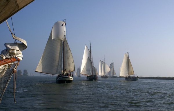 Etwas Besonderes ist am ersten Tag immer der Start. Wenn es der Wind zulässt, gibt es den traditionellen Ankerstart. Mit anderen Worten – auf eine Strecke von über zwei Kilometern liegen alle Schiffe im Krabbersgat vor Anker. Dabei ergibt sich die Reihenfolge aus der Schnelligkeit der Schiffe. Die schnellsten Schiffe liegen hinten und die langsamen vorne. Durch dieses Handicap soll der Wettstreit vergleichbarer bemacht werden – ähnlich wie beim Golf. Um 10:00 Uhr passiert dann vieles auf einen Schlag. Es rasseln die Ankerketten und die Winschen klackern. Viele fleißige Hände kurbeln, ziehen und drücken. So wie die Wetterlage aussah, war für den nächsten Tag erfreulicherweise der traditionelle Ankerstart zu erwarten.