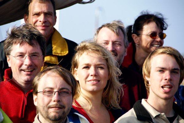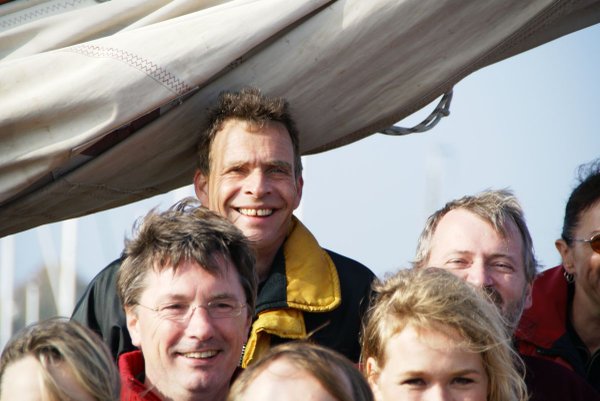 Wim hatte eine Erbsensuppe mit Speckeinlage vorbereitet. Gut 10 Minuten blieben uns – dann war es mit der Ruhe vorbei und wir wechselten bei der Tonne 5 auf einen Halbwindkurs. Unser Blick ging nach wie vor ständig nach hinten. Die Hoge Wier kämpfte und kämpfte. Erneut kam sie wieder näher heran – unglaublich. Das gestrige Erlebnis saß uns noch in den Gliedern. Es waren noch schätzungsweise 10 Minuten bis zum Finnisch. Sollte sich die Geschichte wiederholen? Wie fuhren zunächst wieder auf Steuerbordkurs, um dann mit einem Backbordkurs die Ziellinie anzufahren. Die Hoge Wier machte es andersherum. Damit verloren wir sie wieder etwas mehr aus den Augen. Knapp 5 Minuten später – exakt um 13:34:19 ertönte für uns das Signal des Zielschiffes. Wir hatten die Hoge Wier geschlagen. Unser Arme gingen nach oben – die Revanche hatte geklappt. Da bei Punktgleichheit der zweite Tag mehr zählt, hatten wir damit auch den Gesamtsieg in der Tasche. Die Freude war riesengroß. Leons nächstes Kommando hieß: „Wim ga naar beneiden, onder de trap ligt de ´Schipper Bitter´“. Kurze Zeit später kreisten die Gläser.