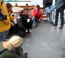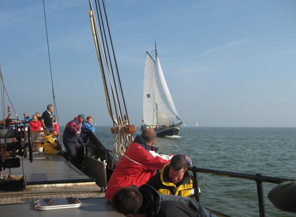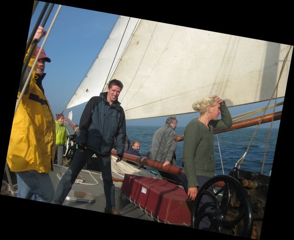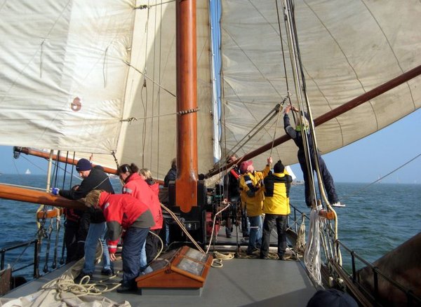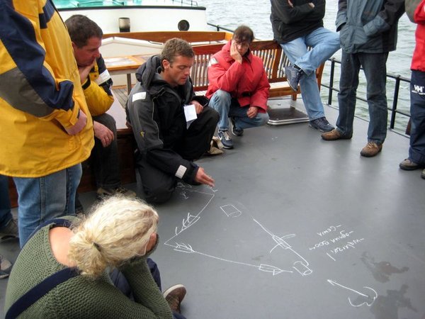 Aus dem gestrigen Tag hatten wir gelernt. So machten wir heute einiges anders. Jeder hatte heute eine absolut feste Position, so dass er sich voll auf seine Aufgaben konzentrieren konnte. Vor jedem Manöver malte Bouke mit Kreide aufs Deck die jeweilige Situation auf – Segelstellung, Windrichtung, Kurse u.s.w.. Ausführlich erklärte er, wer was wann zu tun hatte. Wir erreichten die Luv-Tonne um 12:16 Uhr. Obwohl Leon haarscharf kalkuliert hatte und wir keinen einzigen Meter verschenkt hatten, war uns die Hoge Wier gefährlich nahe gekommen. Nur 1-2 Schiffslängen nach uns nahm sie die Tonne. Unser Segelmanöver klappte perfekt. In Windeseile stand die Genua auf Steuerbord. Fock und Groß gingen nach Backbord. Mit geübten Handgriffen wurde das Wassersegel unter den Großbaum gezogen. Wir atmeten auf – unsere Segel standen perfekt und wird konnten uns auf ein paar Minuten ruhigen „Kaffee-Kurs“ freuen.