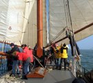 Pünktlich um 10:00 Uhr kam das Startsignal. Jeder begann mit seiner Arbeit. Aber nur kurze Zeit später kam von Leon der Ruf – „Stopp am Großsegel“. Leon schaute skeptisch in Richtung des Waterwolf. Unsere Distanz und Fahrtrichtung waren nicht so, wie er es sich vorher überlegt hatte, so dass Leon sich genötigt sah unsere Taktik kurzfristig zu ändern – um einem möglichen Protest des Skippers vom Waterwolf keinen Raum zu geben. Statt über Backbord zu starten gab er das Kommando über Steuerbord zu gehen. Jascha drückte mit einigen Leuten sofort die Fock in eine Back-Position. Nur langsam änderte das Schiff die Richtung. Nachdem die La Boheme sich gedreht hatte, hieß es – alle Segel so schnell wie möglich nach oben. Da wir vor den Wind gingen, setzten wir jedes Stück Segel, welches wir hatten. Ein Blick zu den anderen Schiffen zeigte schnell – den Start haben wir vergeigt.