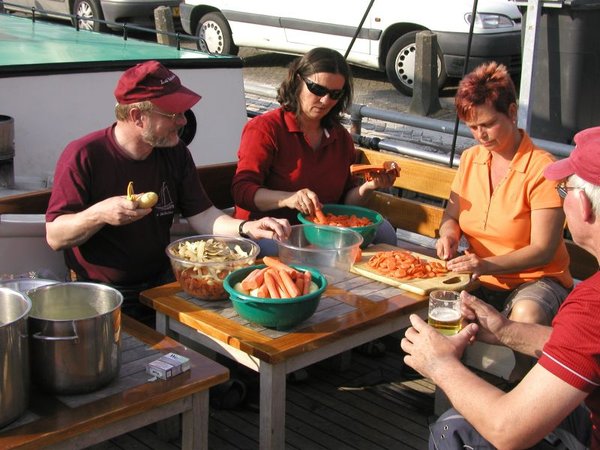 Um 16:30 Uhr übernahm Bernd von Heiner das Ruder, da Heiner mit der Vorbereitung des Abendessens, einem Szegedinger Gulasch beginnen musste. Das Kochen gestaltete sich nicht ganz so einfach. Man musste ständig darauf aufpassen, dass die Töpfe und Pfannen nicht hin und herrutschten. Leon - der das schon gut kennt von Christines Kochaktivitäten - achtete darauf, dass das Schiff so ruhig wie möglich und ohne zu starke Krängung fuhr.