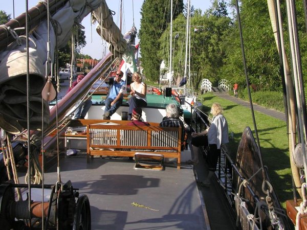 Ein paar hundert Meter weiter versuchte ein Segelschiff abzulegen (16:09 Uhr, N52 58.949 E5 27.099). Das Schiff geriet aus Kontrolle, weil sich die Heckleine gelöst hatte. Und der scheinbar unerfahrene Segler an Land versuchte das Schiff allein mit der Vorleine aus der Hand zu halten - was natürlich nicht gelang. Das Schiff hing plötzlich quer im Kanal. Für uns gab es in dem schmalen Kanal keine Möglichkeit auszuweichen. Leon legte eine Vollbremsung mit voller Schraube rückwärts hin. Auch die zu Hilfe genommen Schwerter konnten es nicht verhindern, dass wir mit dem Schiff leicht kollidierten. Fender verhinderten das Schlimmste. Leon hatte danach alle Händevoll zu tun, damit wir nicht auf der anderen Seite in die liegenden Boote gerieten. Zum Glück ging die Sache für fast alle Beteiligten glimpflich aus. Leider aber nur fast - denn Christian knickte bei der aufkommenden Hektik mit einem Fuß um. Zuerst versuchten wir mit Bordmitteln den Fuß zu kühlen. Wir hatten ja reichlich tiefgefrorene Würstchen an Bord. In Workum holten wir uns dann professionellere Sachen wie Kältespray und Kompressen. Was zu dem Zeitpunkt noch niemand ahnte - für Christian waren alle weiteren Landgänge nicht mehr möglich und er wurde zum Hüter des Schiffes.