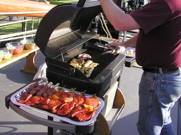 Leon holte den Grill an Deck und die Mannschaft bereitete sich und das Essen für unseren Grillabend vor. Wettermäßig hätte es nicht besser sein können - es wehte ein laues Lüftchen und wir genossen die Abendsonne. Die Auslage des Metzgers hatte nicht zuviel versprochen - das Fleisch war supergut. Es gab Pfeffersteaks, Bauchspeck, ausgelöstes Schweinekotelett, Lammkoteletts und Würstchen (von Akzenta in Wuppertal). Dazu hatte Inge leckere Folienkartoffeln und grünen Salat vorbereitet. Wir fragten uns, warum wir so etwas nicht schon früher gemacht haben.