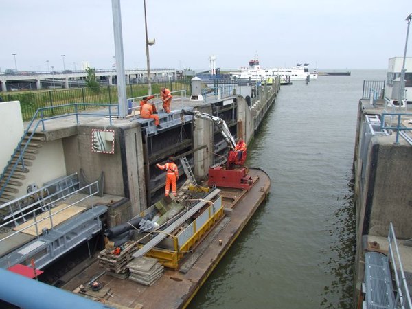 Zurück an Bord ging Leon zu den Arbeitern in der Schleuse. Mit froher Kunde kam er zurück. Sie waren fertig und kündigten an, dass in kürze wieder schleusen würde. Wir machten uns startklar - aber ein Teil der Crew war noch an Land. Über Handy versuchten wir die Abgängigen zu erreichen. Nur einen Teil konnten wir benachrichtigen. Sie kamen aber nicht mehr rechtzeitig zurück. Mit halber Besetzung gingen wir durch die Schleuse. Unsere Fahrt - sprich die Bewegung unseres Mastes - blieb nicht unbeobachtet. Auf der anderen Seite stießen die Landgänger zu uns. Leon fuhr mit dem Bug an den Kai und wir nahmen alle an Bord auf.