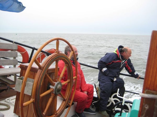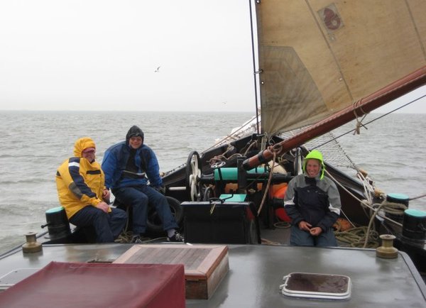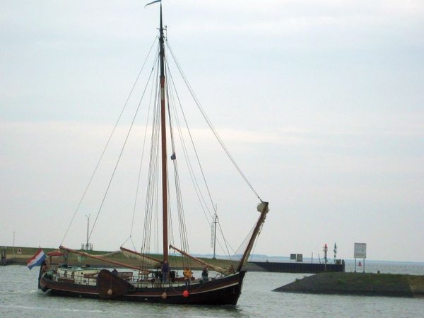 Das Wetter hatte sich nicht wie erwartet verbessert. Es war immer noch windig, kalt und es regnete sogar. Bis zum Lauwersmeer mussten wir wieder motoren. Nur die härtesten standen im Regenzeug an Deck. Gegen 12:00 Uhr erreichten wir die ersten Ausläufer des Lauwersmeers und wir setzten Segel. Gerefft ging es bei 5-6 Windstärken nach Lauwersoog. Schon von weitem konnten wir bei der Schleuse Doppelrot sehen. Dort angekommen erfuhren wir den Grund. Für den heutigen Tag waren Arbeiten an der Schleuse angesagt. Das war natürlich übel - denn wenn wir bis 16:00 Uhr nicht durch die Schleuse fahren können, reicht das Wasser nicht mehr aus, um heute nach Schiermonnikoog zu kommen. Wir legten uns direkt vor die Schleuse und überlegten zunächst was wir tun wollen. Im Lauwersmeer gibt es keine Anleger, wo wir mit unserem Schiff liegen können. Wir kamen zu keiner Entscheidung. Derweil bereite Angelika aus den Resten des Nudel-Gehacktes-Auflauf eine kleine Zwischenmahlzeit. Ein Teil der Crew ging in den Hafen um ein paar Kibbelinge zu essen. Dort gab es auch einen kleinen Supermarkt, wo wir unsere Vorräte auffrischten.