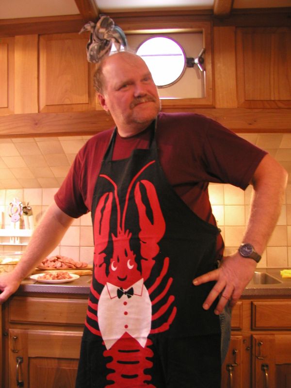 Auch unter Deck gab es reichliche Aktivitäten. Die Kabinen wurden aufgeräumt, die Taschen gepackt - und der Kühlschrank geleert. Aus den Resten kam noch ein kleiner Imbiss zusammen (Klos mit Soß, dazu Deutschländer Würstchen und gegrilltes Schweinefleisch).