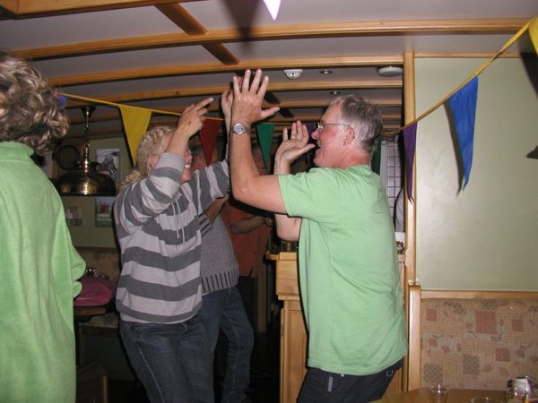 Nach und nach kam immer mehr Rhythmus in die Crew. Um 24:00 Uhr hielten dann plötzlich alle inne - um gemeinschaftlich ein Happy Birthday zu schmettern. Der Zahlmeister hatte heute Geburtstag. Nach dem Anstoß mit einem Glas Sekt, gab es ein Geburtstagsgeschenk für Heiner - eine Unterhose im La Bohème-Design und dazu ein Schmusekopfkissen. Die Freude war groß.