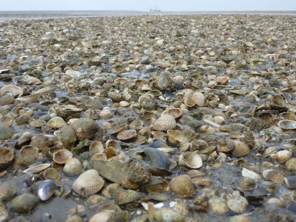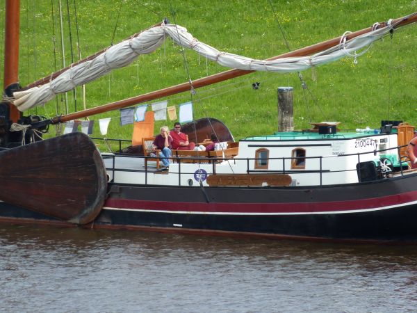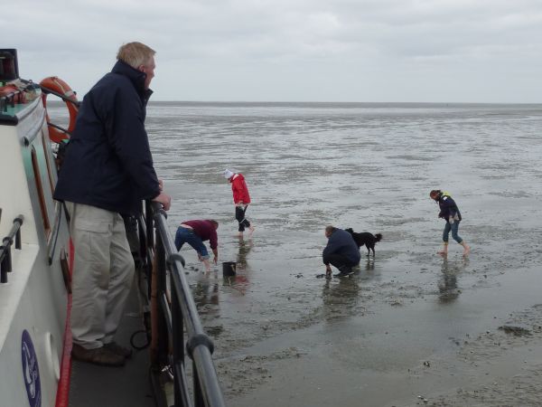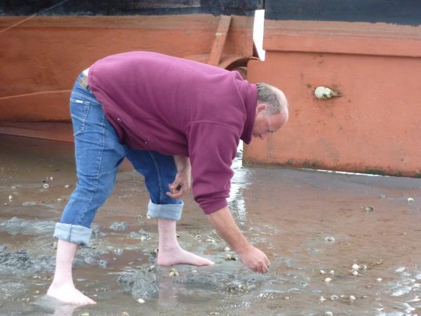 Nachdem das Wasser abgelaufen war, montierte Andreas unsere Planke an der Bordwand, so daß wir aussteigen konnten. Leon schnappte sich zwei Eimer und grub nach Herzmuscheln. Andere taten es ihm nach. Wir erkundeten die Gegend und statteten auch der Lemster Ark einen Besuch ab. Von der Mannschaft war nichts zu sehen. Dem Geruch nach saßen sie beim Abendessen.