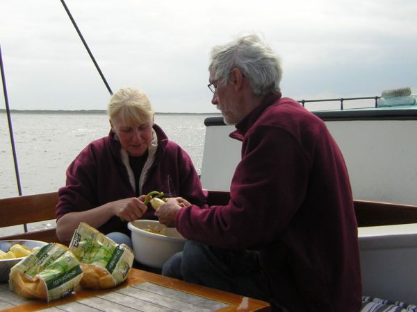 Inge hatte sofort - wie gewohnt - die Regie in der Küche übernommen. Wie im Hotel gab es Rührei, frische Rohkost, selbst gemachten Fleischsalat und vieles mehr. Nach Frühstück brachten wir unsere Autos nach Westwoud auf Leons Bauernhof - ein kluge Entscheidung, wie sich im Laufe des Törns noch herausstellen sollte.