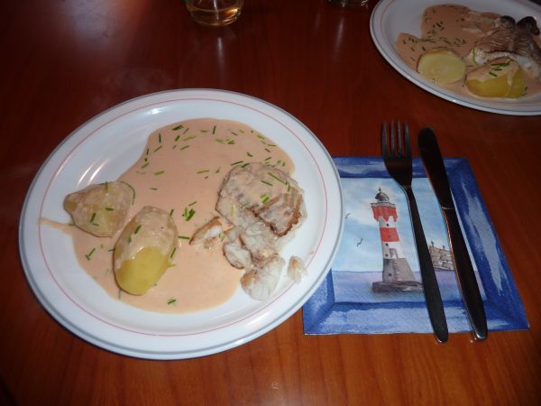 Gesättigt und zufrieden schlenderten wir wieder zum Schiff. Hipof holte sein Chirurgenbesteck heraus und befreite den Kabeljau von Gräten. Andreas machte aus den Resten der Königsberger Klopse ein leckeres Vorsüppchen. Der Fisch war ein Gedicht. Von allen gab es die Höchstbenotung von 10 Punkten.