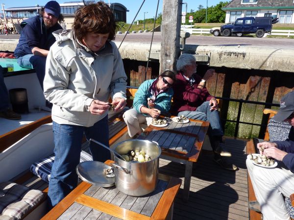 Mit dem Einlaufbier belohnten wir uns für die Mühen. Mit der Zeit kamen noch zwei weitere Schiffe und legten sich zu uns ins Päckchen. Wir saßen an Deck und genossen die Abendsonne. Leon schaute auf die Spundwand und stieg plötzlich - ohne Kommentar außenbords zwischen Bord- und Spundwand. Zurück kam er mit mehreren Austern. Er knackte sie auf und - der Inhalt sah ganz gut aus. Nachdem er die ersten zwei gegessen hatte - wurde auch Heiner mutig. Es war die erste Auster in seinem Leben. Sie schmeckte nicht so, wie er es erwartet hatte - sprich eher wie Hafen ganz unten. Eine Delikatesse stellt man sich zwar anders vor - aber sie war genießbar. Außer Sebastian fanden sich keine weiteren Probanden.