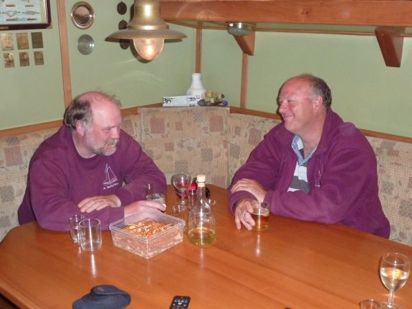 Kurz vor Lauwersoog suchten wir vergeblich die Hafeneinfahrt. Eigentlich hätte sie gut zu sehen sein müssen. Des Rätsels Lösung war ein vor der Einfahrt auf Reede liegendes großes Schiff. Nachdem wir es umfahren hatten, lag die Einfahrt deutlich vor uns. Vorsichtig tasteten wir uns in den Hafen und suchten uns einen freien Platz. Um halb drei stellten wir die Maschine aus. Die meisten der Crew verschwanden schnell im Bett. Leon, Andreas, Harald und Heiner trafen sich an Tisch drei und hielten mit leckerem Scotch noch eine Manöverbesprechung ab. Wir haben schon einige Nachtfahrten mitgemacht - aber diese Nachtfahrt war mit Abstand die anstrengendste und spannendste Fahrt - selbst Leon war beeindruckt. Das Watt um die niederländischen Inseln kennt Leon wie seine Westentasche. Aber im Ostwatt ist auch Leon nicht alle Tage. So fachsimpelten wir so vor uns hin und leerten die eine oder andere Flasche. Kurz vor sechs ging´s dann endgültig in die Koje.