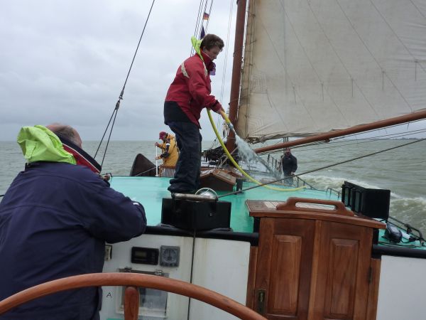 Nun stand uns der letzte Schlag für den diesjährigen Törn bevor. Bei bedecktem Himmel - was auch sonst - legten wir zur gewohnten Zeit kurz nach zehn Uhr mit Ziel Enkhuizen ab. Wir nutzten die Rückfahrt um das Deck zu schrubben. Das Salz von den letzten drei Wochen mußte vom Schiff.